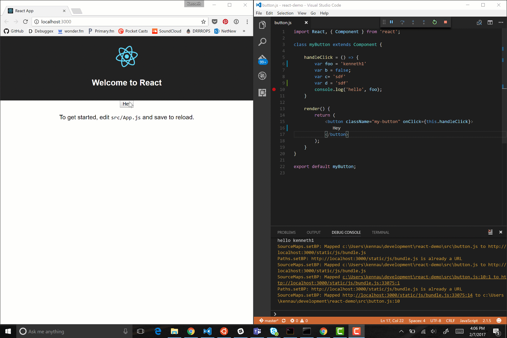 一个在 VS Code 里调试 React.js 的例子: